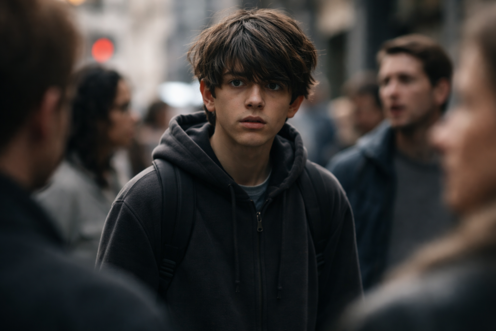 Es war ein gewöhnlicher Tag in der Stadt. Eine Kreuzung. Menschen eilten vorbei, Autos flossen dicht hintereinander durch die Straßen. Der Junge stand am Fußgängerüberweg. Den Kopf gesenkt. Er schaute auf die Ampel, aber nicht auf die Menschen.