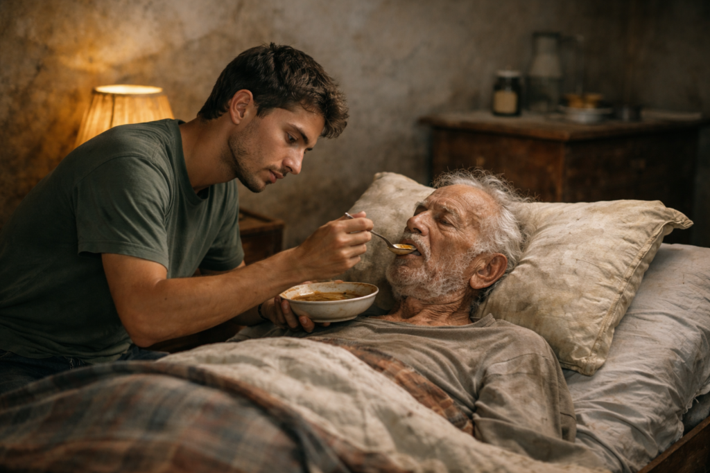 Er wusch einen Körper, der sich selbst nicht mehr gehörte. Er reinigte Dinge, die andere „Krankenhäusern“ überlassen würden. Er wechselte die Bettwäsche – manchmal mehrmals pro Nacht.
